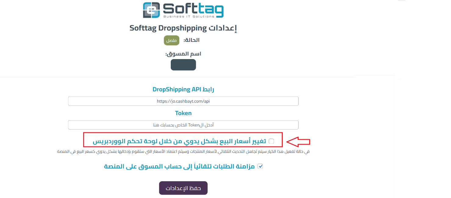 إعدادات الإضافةإذا اردت عدم التقييد بسعر البيع المقترح في المنصة يمكنك الغاء تفعيل ( تغيير أسعار البيع بشكل يدوي من خلال لوحة تحكم الووردبريس )